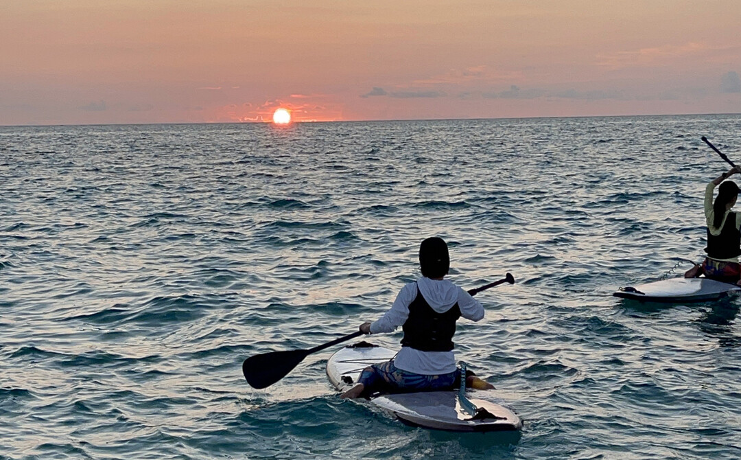 珊瑚礁を見学、ウミガメと泳ぐ、幻の島「百合ヶ浜」ツアー、薬草サウナ、朝日サップなどなど、天気と海の状況をみてアクティビティが決まります。ビーチヨガも毎日行います。